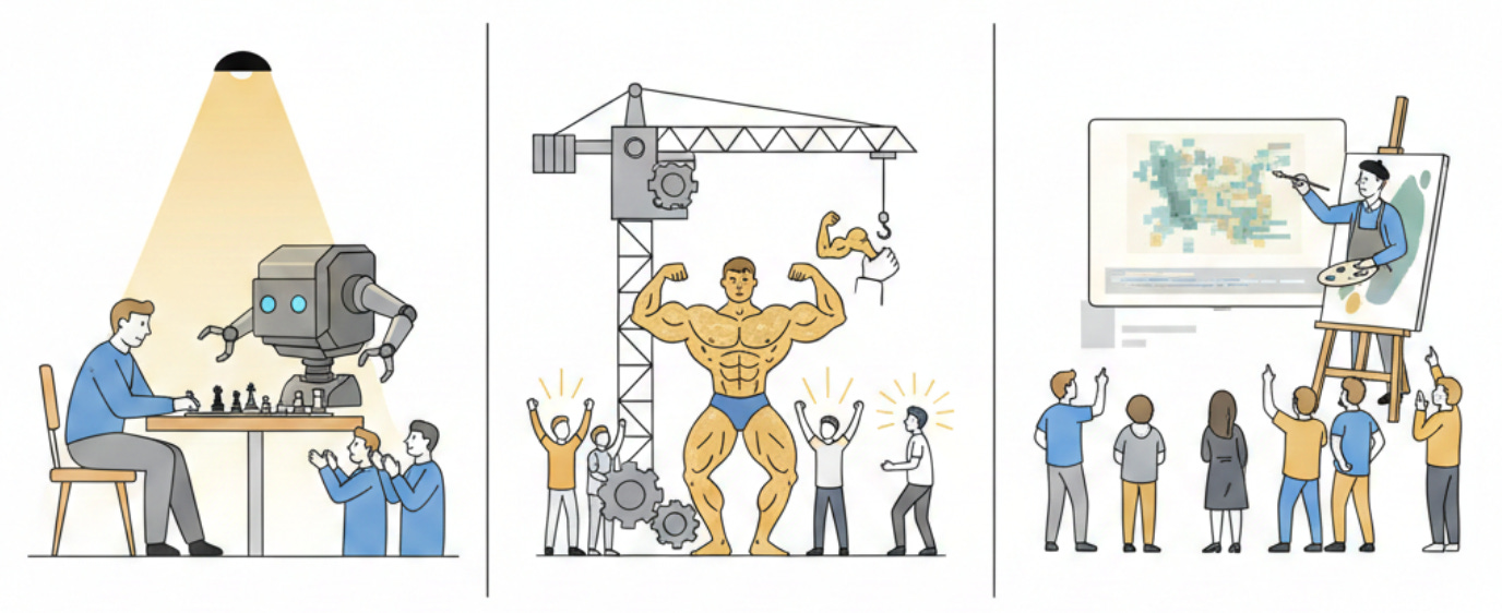 The best chess player has been an AI for over a decade. The strongest lifter on earth is a crane. Yet the top human chess players, bodybuilders, and artists command respect, status, and money.