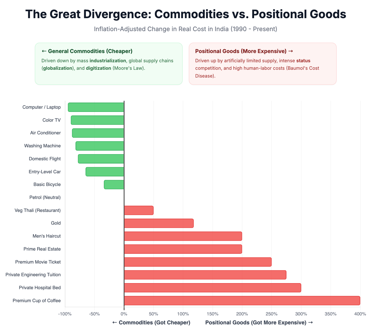 These are not contradictions to the abundance thesis. They are exactly what the thesis predicts. The stuff that can be mass-produced like data, grain or compute gets cheap. The stuff that can’t, because it’s tied to land, to human attention, to institutional prestige gets expensive. Your roti is cheap. Your rent in Bandra is not.